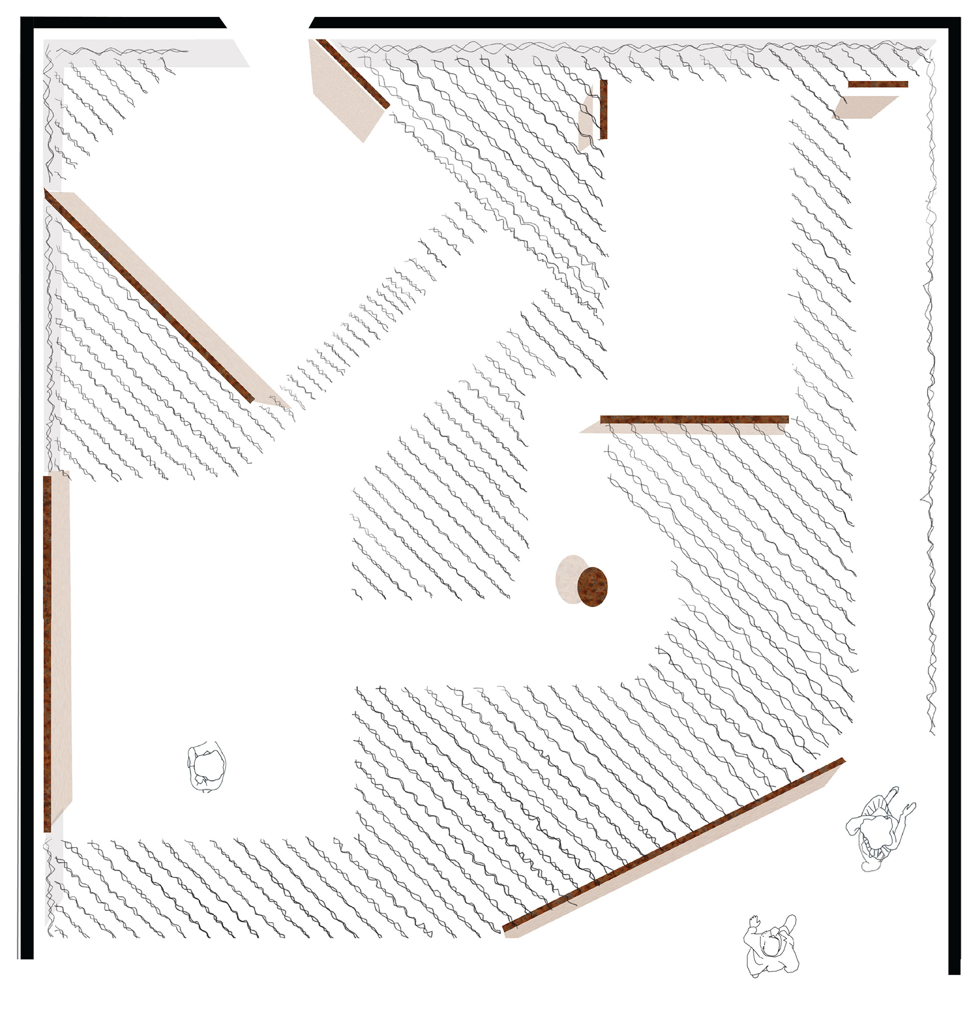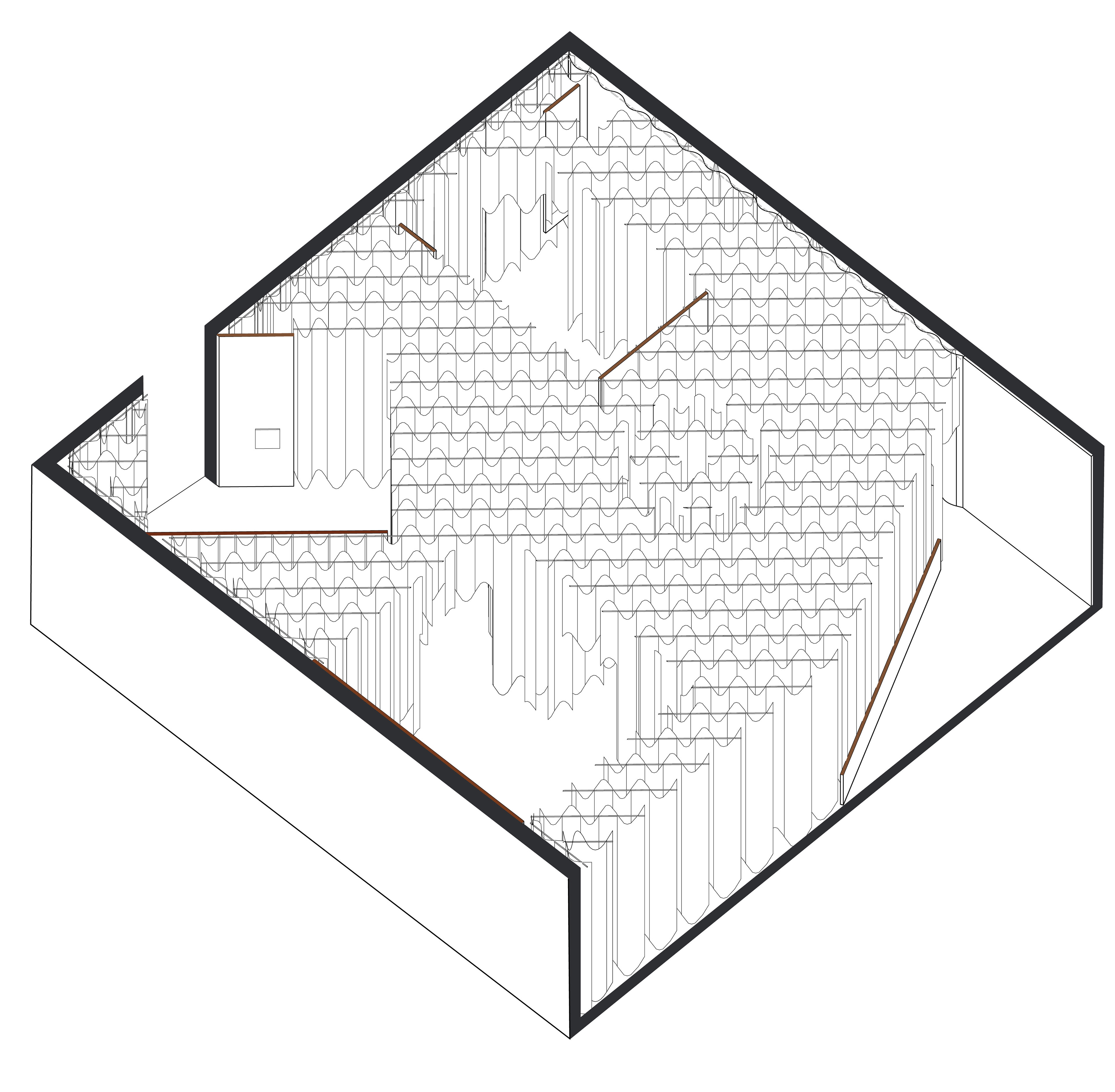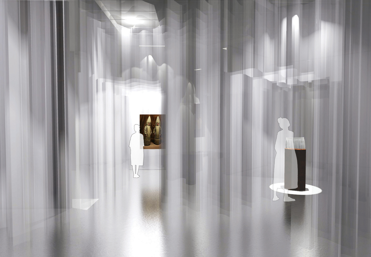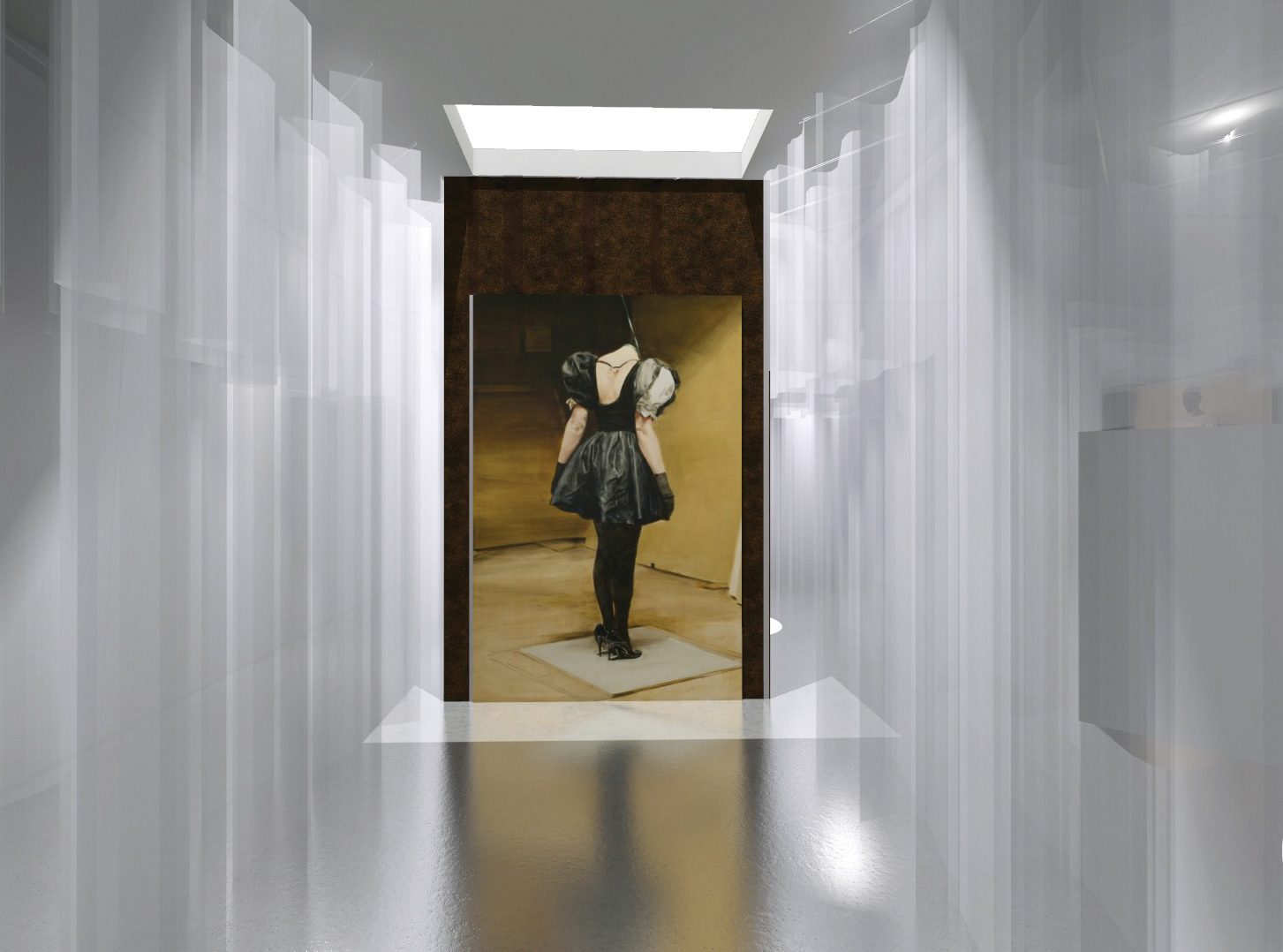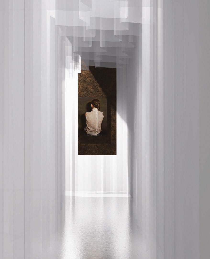 Borremans schildert foto’s die hij trekt van zijn modellen.. Daarbij viel me onmiddellijk op hoe hij de lichtinval met stof laat spelen. In de vormgeving heb ik dus gekozen om de bezoeker te laten reizen door dikke pakken van voile die opgesteld zijn in de ruimte. Hier heb ik ‘doosjes’ uitgesneden waar de bezoeker de ruimte krijgt om in dialoog te gaan met de werken die met zenithaal licht belicht worden. De doorgangen zijn verlicht met ‘noorderlicht’ of zacht licht, net zoals Borremans met licht speelt in zijn schilderijen. De werken worden afgezet tegen Cortenstaal om ze beter tot uiting te laten komen. Het ruwe van de Cortenstaal geeft een prachtig contrast met het zachte en fijne van de voile. Mijn zoektocht naar vervreemding.